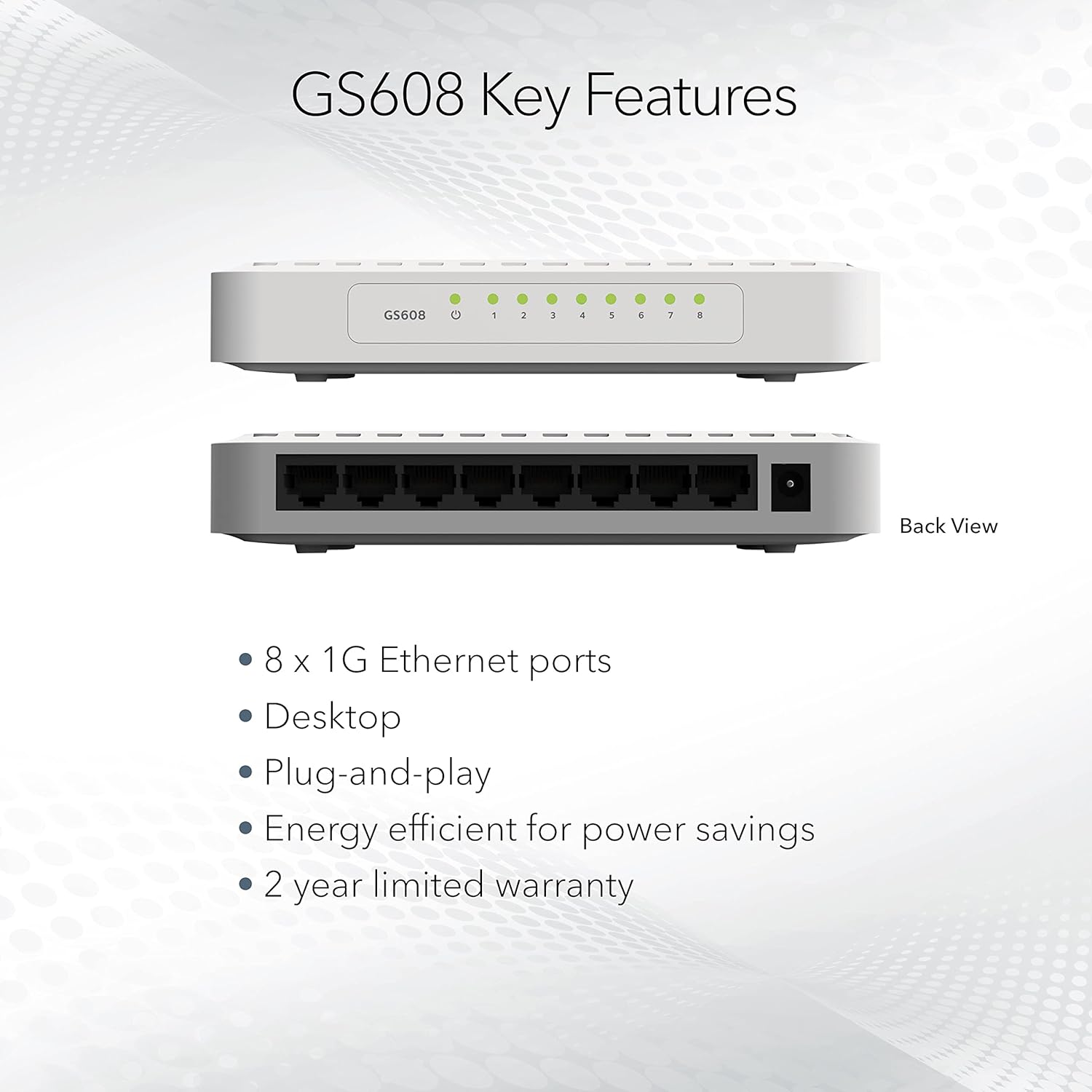 Netgear GS608: Conmutador Switch Gigabit Ethernet No Administrado de 8 Puertos, Plug-and-Play, 10/100/1000 Mbps y Diseño Silencioso