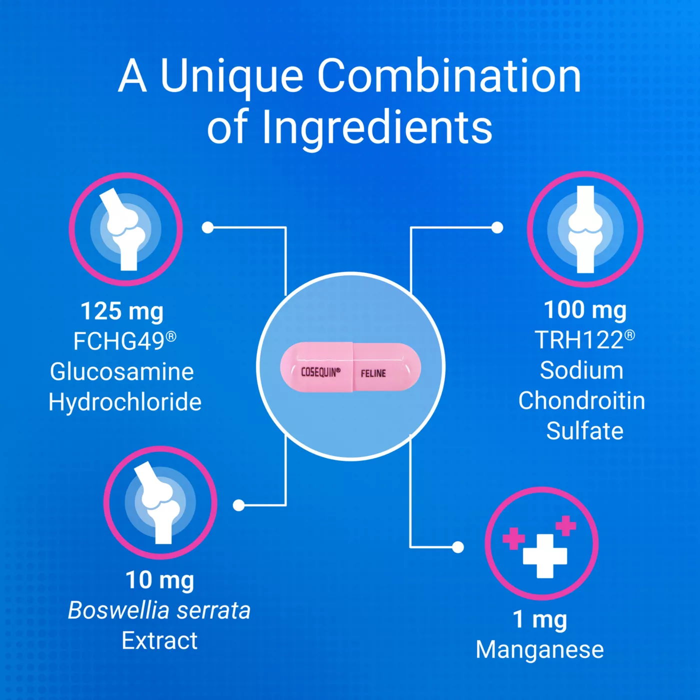 Cosequin es la marca #1 recomendada por veterinarios para la salud articular felina. Esta versión especial incluye Boswellia para ofrecer una respuesta más rápida y efectiva ante los problemas de movilidad.
