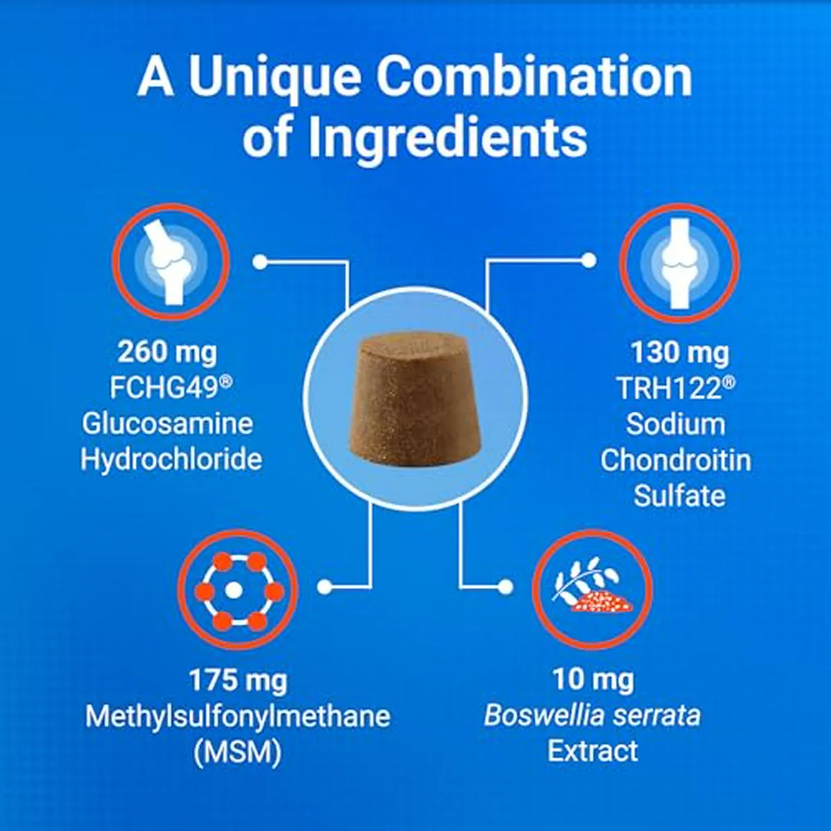 MSM (Metilsulfonilmetano): Proporciona azufre orgánico para fortalecer los tejidos conectivos y actúa como un soporte analgésico natural.