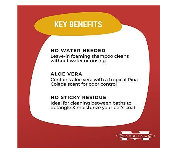 Champú espumoso sin agua, no se necesita agua para este champú espumoso sin agua. Ideal para animales pequeños que no necesitan un baño completo, solo una limpieza rápida. Limpia y acondiciona sin agua ni enjuague y no deja residuos pegajosos. Disponible en un aroma tropical de piña colada con aloe. Ideal para todos los animales pequeños de cualquier edad.