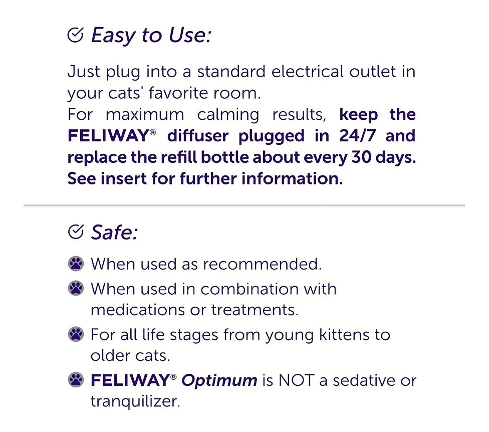 Eficacia 3 en 1: A diferencia de otras versiones, Optimum funciona tanto para el estrés individual (marcaje, arañazos) como para las tensiones entre gatos (peleas, persecuciones) y la adaptación a cambios (mudanzas, nuevas mascotas).