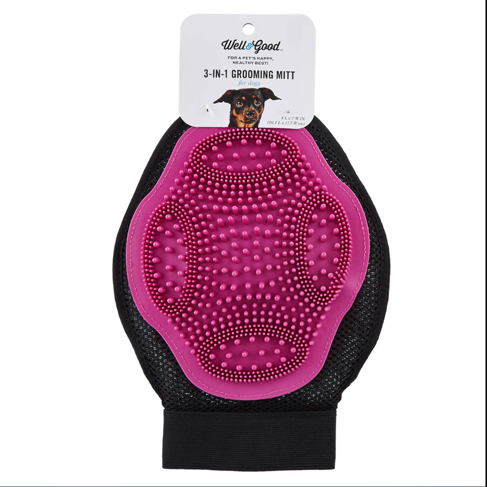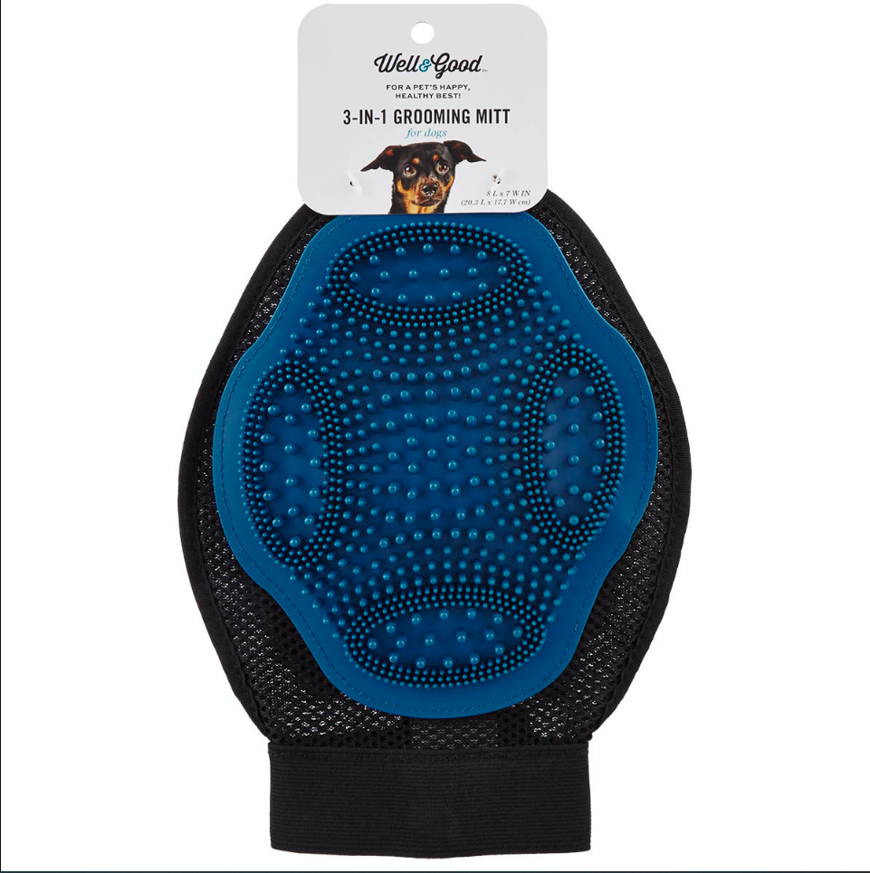 El guante de aseo para perros 3 en 1 de Well & Good, hace espuma al momento del baño, cepilla y ayuda a retirar el pelo muerto de tu mejor amigo y también recoge el pelo de ropa y muebles. Excelente para utilizar dentro y fuera de la regadera. También es de secado rápido y reutilizable para que pueda pasar rápidamente del aseo húmedo o mojado al sec