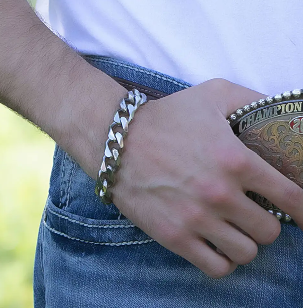 Una pulsera cuyo fuerte diseño es el acento perfecto para cualquier hombre. Este brazalete de eslabones está creado con eslabones cubanos, un eslabón de estilo facetado que tiene una fluidez única al tacto de los eslabones en la mano. Los eslabones más gruesos le dan un aspecto más resistente al brazalete. La pulsera mide 9 pulgadas de largo y tiene un cierre desplegable.
