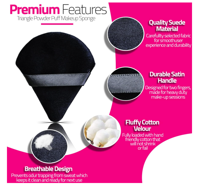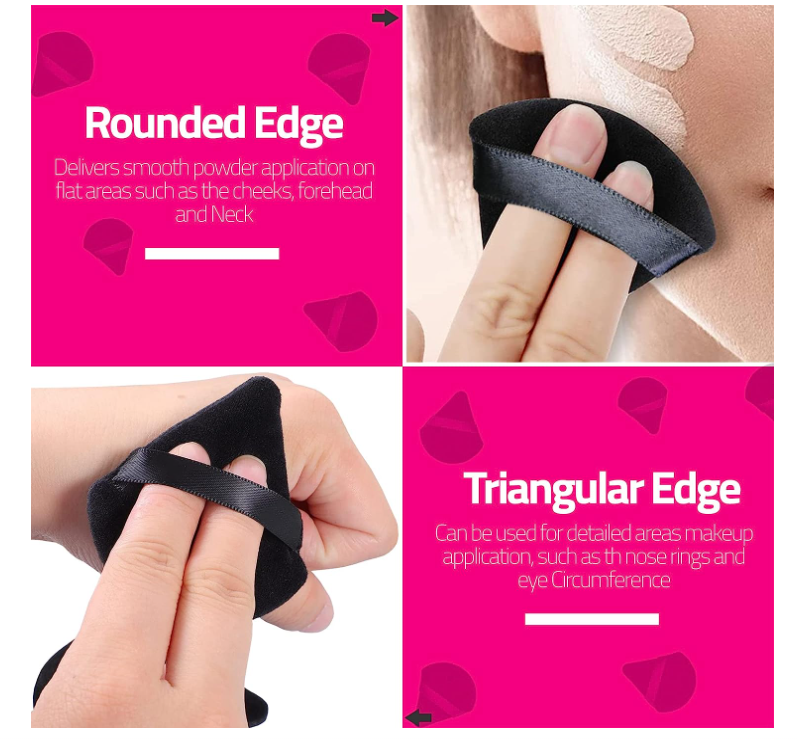 Diseño mejorado: ahora no tienes que preocuparte por el maquillaje desigual. Nuestros polvos de maquillaje vienen con diseño triangular y redondo. Al aplicar la base en las mejillas y la frente, utiliza el lado redondo; cuando se aplica a los ojos, utiliza el lado triangular.